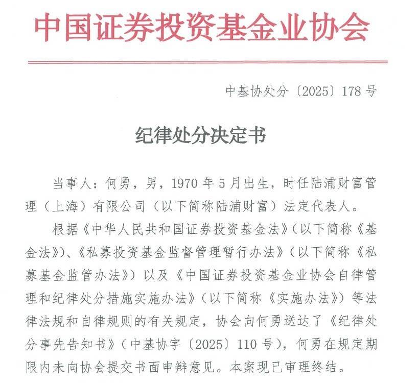 根据《基金法》《私募基金监管办法》《实施办法》等相关规定,中基协决定作出以下纪律处分:暂停受理陆浦财富私募基金产品备案六个月,对何勇进行公开谴责。